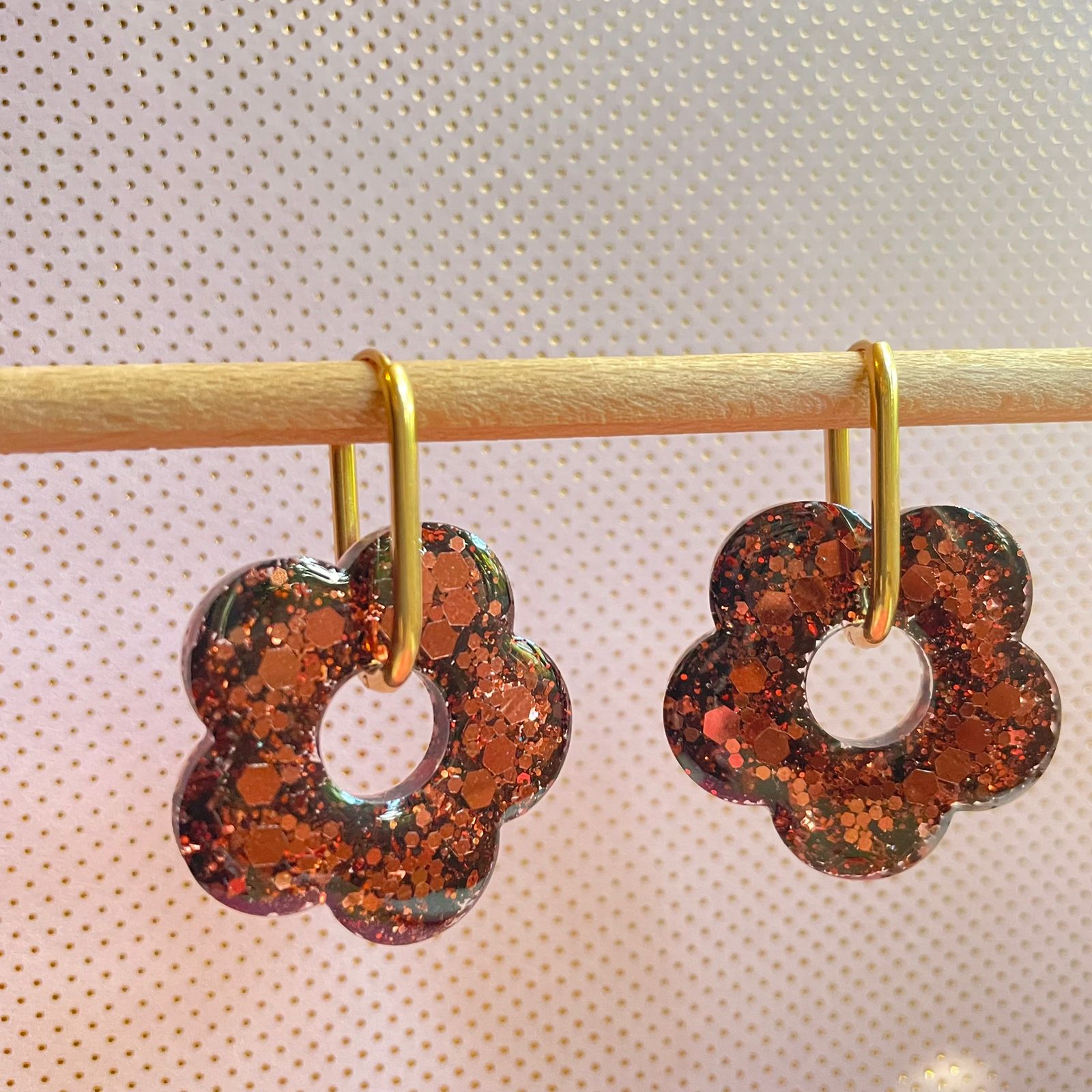 Ces jolies fleurs ultra féminines sont créées en résine et remplies de paillettes, car on le sait, les paillettes c'est la vie ! Elles existent dans différents coloris et s'adaptent à toutes les créoles.