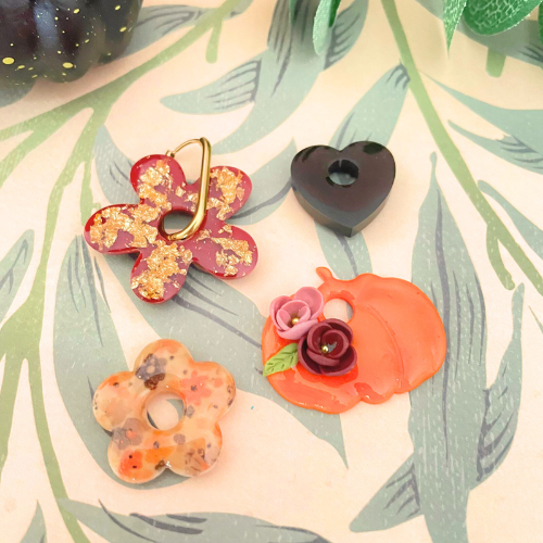 De la couleur, des paillettes, de la feuille d'or, des fleurs séchées, pleins de formes sympas, en résine et en argile polymère et des créoles en acier inoxydables